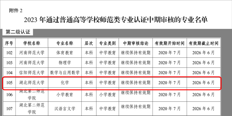 近日,教育部办公厅公布了2023年通过普通高等学校师范类专业认证的专业名单及中期审核专业名单(教师厅函〔2023〕24号)。我院化学专业通过师范类专业认证中期审核(认证有效期为2020 年7月至2026年6月)。