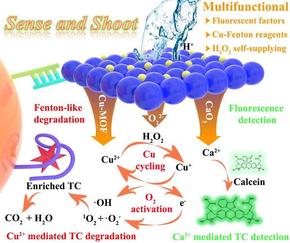 同时实现水环境中低载量暴露抗生素的灵敏检测和高效降解一直以来是环境分析领域一项艰巨的任务。近日,李新博士研究团队设计合成了一种多功能化的复合材料CaO2@Cu-MOF NSs,成功实现水环境暴露四环素的一体化检测和消除。在H+的引发作用下,功能化复合物可产生用于荧光检测四环素的信号因子Ca2+,以及用于四环素氧化降解的活性物种H2O2与Cu2+。一方面利用DNA循环扩增和纳米增效的双重信号放大作用,实现低载量暴露四环素的高灵敏检测。另一方面,利用产生的Cu2+和H2O2,构建基于Cu2+/Cu+循环介导的新型类芬顿氧化和分子氧活化体系,作用于四环素的高效催化降解。该体系成功应用于实际水样中低载量暴露四环素的一体化灵敏检测与高效降解。
