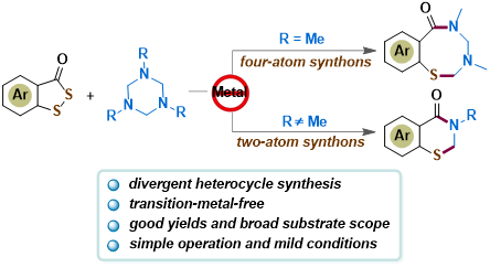 由于含硫杂环化合物在生物活性天然产物、药物分子和功能材料中的重要应用,含硫杂环的构建在合成化学领域受到了广泛关注。相比于构建五元和六元硫杂环化合物,含硫中环化合物的合成由于存在着不利的熵效应和跨环张力,构建含硫中环化合物更具有挑战性。因此,开发简单绿色的合成路线实现含硫中环化合物的高效构筑一直是有机合成化学的研究目标之一。基于此,湖北师范大学周耀博士研究团队报道了无金属条件下取代基控制的苯并二磺酚酮与六氢-1,3,5-三嗪化合物发散环化反应,利用六氢-1,3,5-三嗪化合物作为四元/二元合成子,在温和的条件下,合成一系列八元环化合物和六元环化合物。
