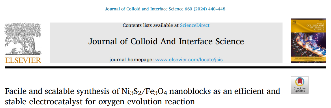 日前,国际知名期刊Journal of Colloid and Interface Science(《胶体与界面科学杂志》)发表了新葡萄研究生梅静在电解水析氧催化剂领域的研究成果,论文题目为“Facile and scalable synthesis of Ni3S2/Fe3O4 nanoblocks as an efficient and stable electrocatalyst for oxygen evolution reaction”(Ni3S2/Fe3O4纳米块作为一种高效、稳定的析氧反应电催化剂),2021级硕士研究生梅静为论文第一作者。Journal of Colloid and Interface Science是一本由Academic Press Inc Elsevier Science出版社旗下收录物理化学领域相关研究成果的国际一流期刊,是SCI中科院大类一区Top期刊,最新影响因子为9.9。