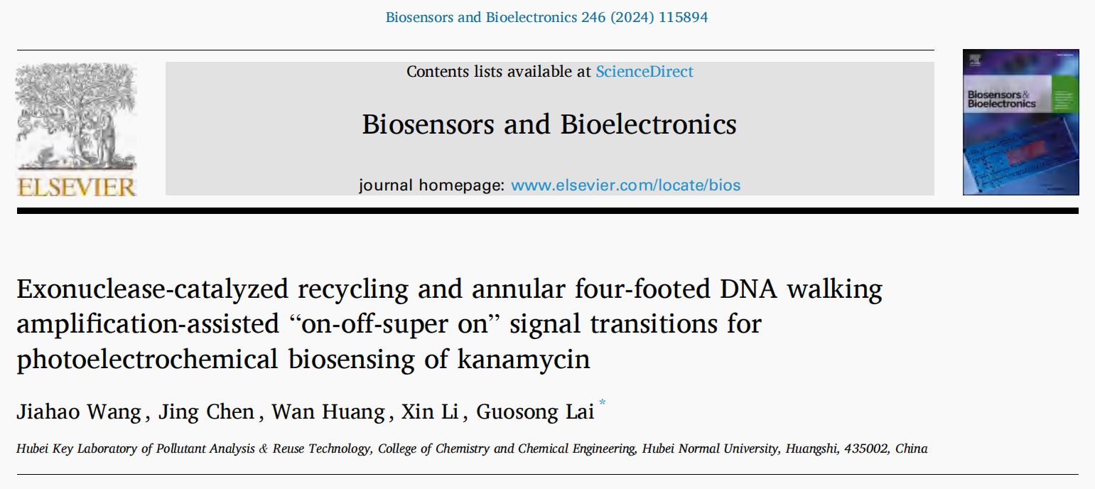 其中,将核酸外切酶催化循环与环状四足DNA步行机信号放大作用相结合,成功发展了一种基于光电极“on-off-super on”信号转换的光电化学生物传感新策略。该工作以“Exonuclease-catalyzed recycling and annular four-footed DNA walking amplification-assisted “on-off-super on” signal transitions for photoelectrochemical biosensing of kanamycin” (核酸外切酶催化循环及环状四足DNA步行放大辅助的“on-off-super on”信号转换用于卡那霉素光电化学生物传感)为题,发表于Biosensors and Bioelectronics(《生物传感器和生物电子学》)。2021级研究生王佳浩为论文第一作者,赖国松教授为论文通讯作者,湖北师范大学为论文唯一通讯单位。Biosensors and Bioelectronics系ELSEVIER出版社旗下国际知名期刊,SCI中科院大类一区,最新影响因子为12.6。