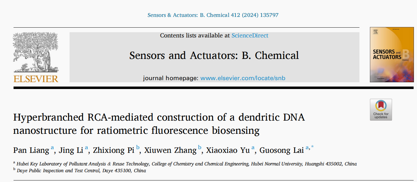 利用目标物生物识别作用触发的超支化滚环扩增(RCA)反应来构建一种镁离子DNA酶(MNAzyme)修饰的树枝状DNA纳米结构,成功发展了一种比率型荧光生物传感新策略。该工作以“Hyperbranched RCA-mediated construction of a dendritic DNA nanostructure for ratiometric fluorescence biosensing” (超支化RCA介导树枝状DNA纳米结构构建用于比率荧光生物传感)为题,发表于Sensors and Actuators: B. Chemical(《传感器和执行器 B:化学》)。2021级研究生梁盼为论文第一作者,赖国松教授为论文通讯作者,湖北师范大学为论文唯一通讯单位。Sensors and Actuators: B. Chemical系ELSEVIER出版社旗下国际知名期刊,SCI中科院大类一区,最新影响因子为8.4。