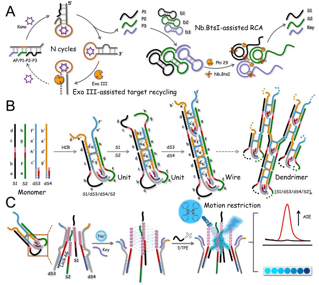 基于G-四链体修饰DNA网状纳米结构放大组装的AIE荧光生物传感示意图
