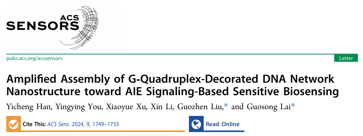 利用目标物识别反应来引发一种G-四链体功能化DNA纳米网状结构的放大组装,成功发展了一种基于标记核酸的新颖聚集诱导发光(AIE)生物传感策略。该工作以“Amplified assembly of G-quadruplex-decorated DNA network nanostructure toward AIE signaling-based sensitive biosensing” (G-四链体修饰DNA网状纳米结构的放大组装用于AIE信号输出的灵敏生物传感)为题,发表于ACS Sensors(《美国化学会 传感器》)。2021级研究生韩易成为论文第一作者,赖国松教授和香港中文大学(深圳)刘国珍教授为论文共同通讯作者,湖北师范大学为论文第一通讯单位。ACS Sensors系ACS出版社旗下国际知名期刊,SCI中科院大类一区,最新影响因子为8.9。