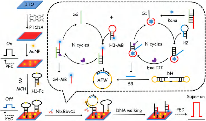 1. Exonuclease-catalyzed recycling and annular four-footed DNA walking amplification-assisted “on-off-super on” signal transitions for photoelectrochemical biosensing of kanamycin