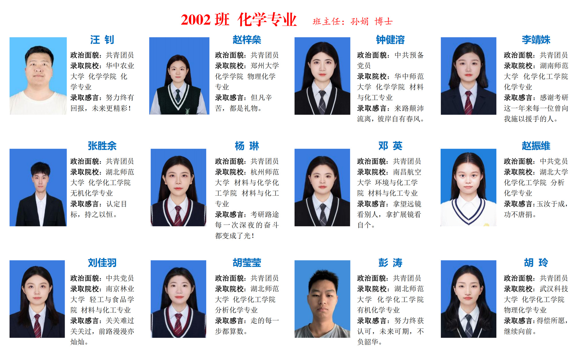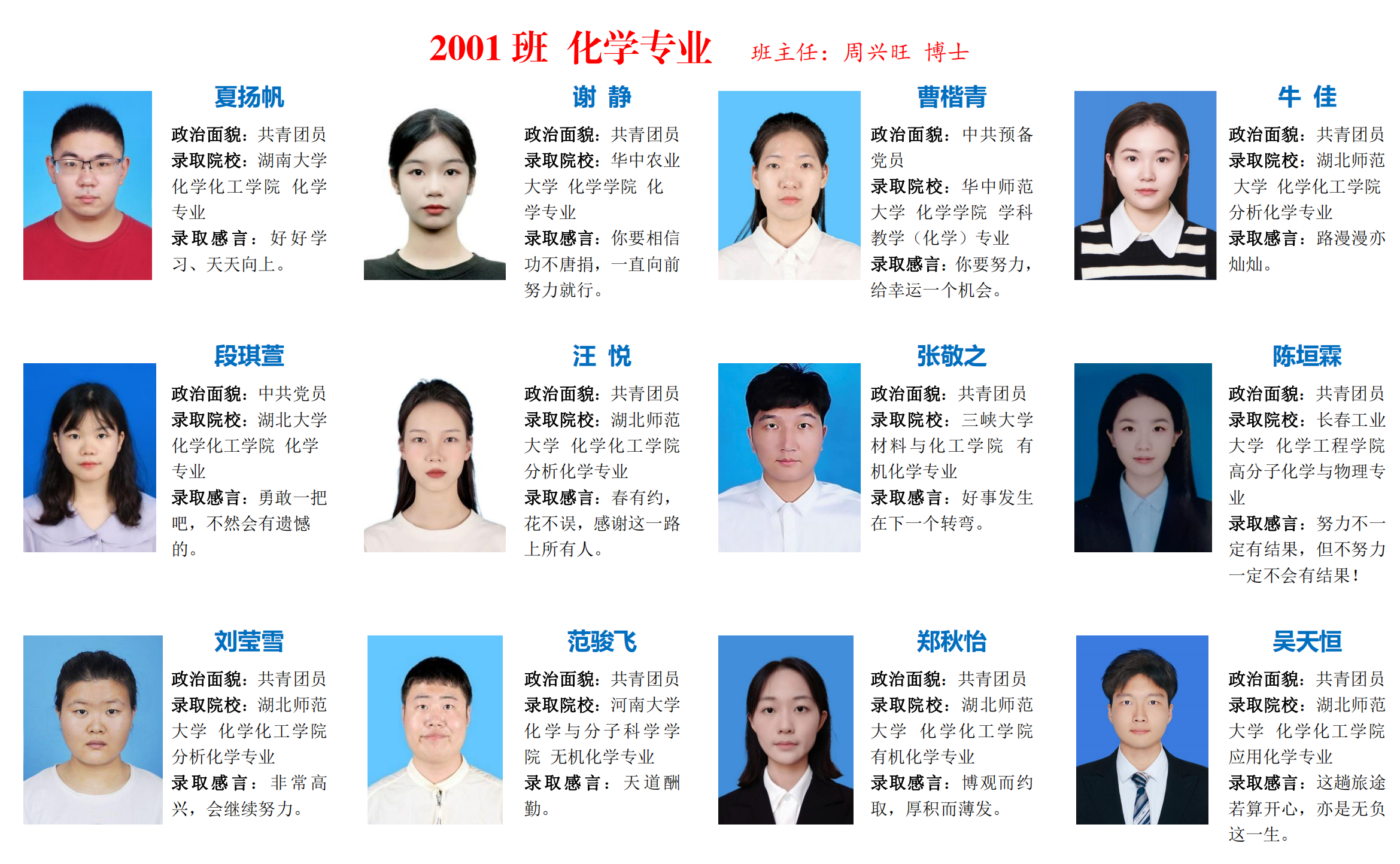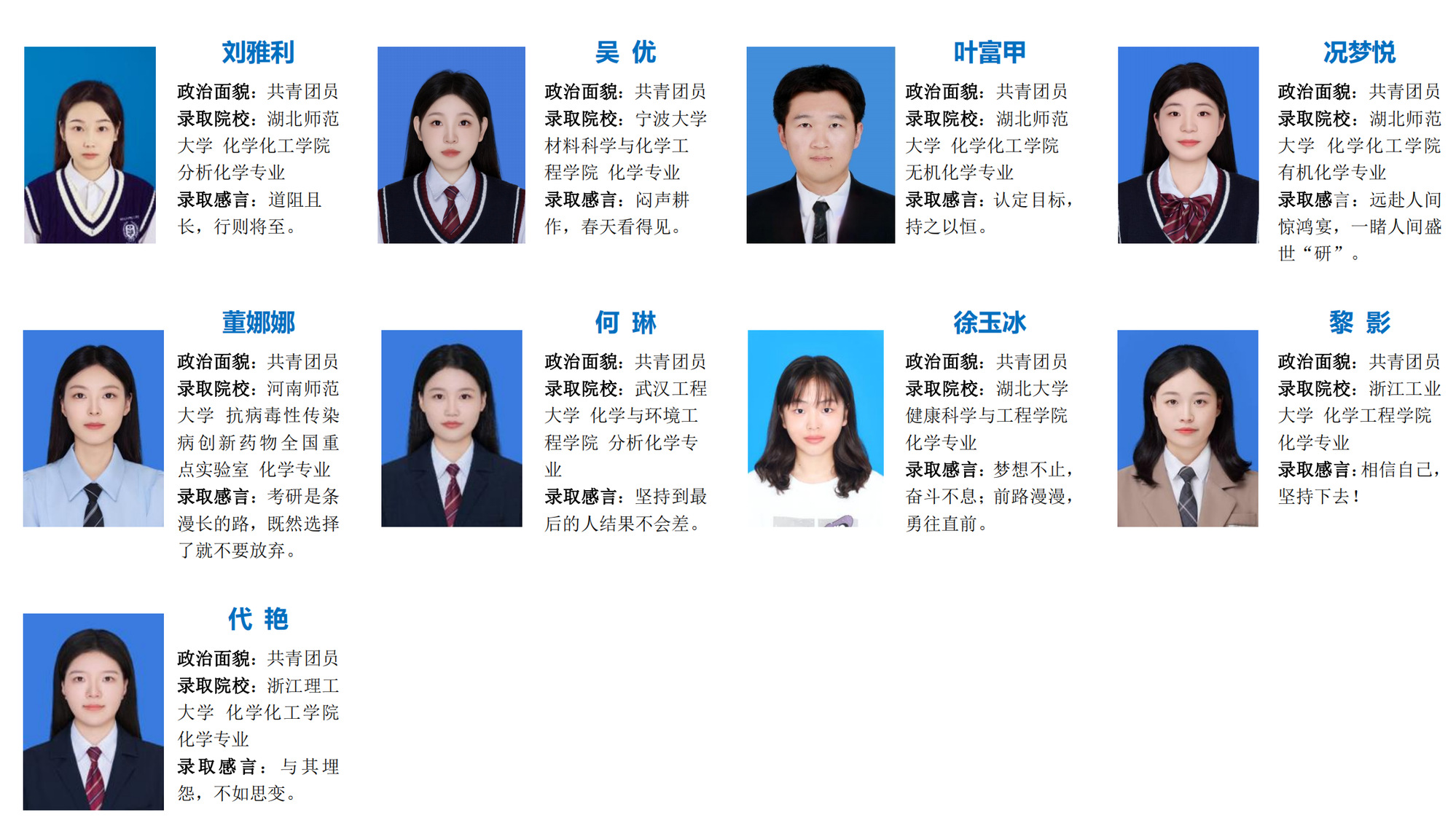 编者按:执笔耕耘梦想,持卷浅吟年华;踏上“研”途,便只顾风雨兼程。这一趟有山重水复,也终见柳暗花明;虽漫长而艰辛,但终有回报之日。新葡萄2024届284名本科毕业生中122人被国内外高校(研究所)录取,升学率达42.96%,创学院考研录取率历史新高。本期推送化学专业考研光荣榜,他们以热爱砥砺前行,以赤诚谱写青春,在无数个默默拼搏的夜晚之后,终于迎来最绚烂的曙光。