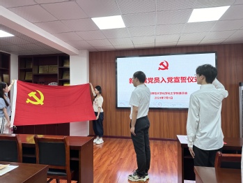 为庆祝中国共产党成立103周年,重温党的光辉历程、传承党的优良传统,激励党员坚定理想信念,加强党性教育,增强荣誉感和归属感,7月1日下午,学院党委在五楼会议室举行2024年新发展党员入党宣誓仪式。院党委书记罗鸿飞、党委副书记吴天真、学生党支部书记和上半年新发展的16名党员参加入党宣誓仪式,部分入党积极分子代表列席。仪式由辅导员郭先哲主持。