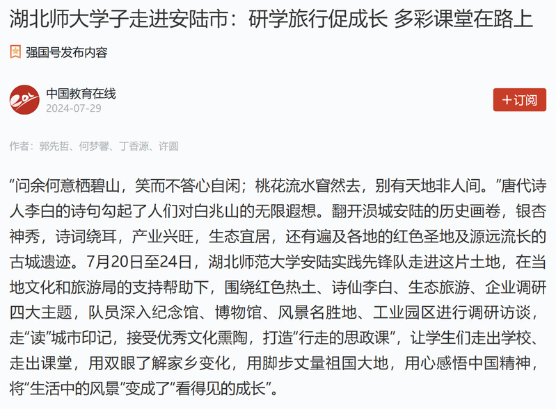 为深入学习宣传贯彻习近平新时代中国特色社会主义思想和党的二十大精神,推进“青春建功”行动深入实施,经学院申请,校团委审核,新葡萄“安陆踏歌行 实践谱新篇”项目被立项为湖北师范大学2024年暑期“三下乡”社会实践活动重点项目。7月20日至24日,由辅导员郭先哲和新葡萄14名学生组成的安陆实践先锋队在安陆围绕红色热土、诗仙李白、生态旅游、企业调研四大主题,深入纪念馆、博物馆、风景名胜地、工业园区进行调研访谈,走“读”城市印记,接受优秀文化熏陶,打造“行走的思政课”。近日,“学习强国”学习平台对以上工作进行了报道。