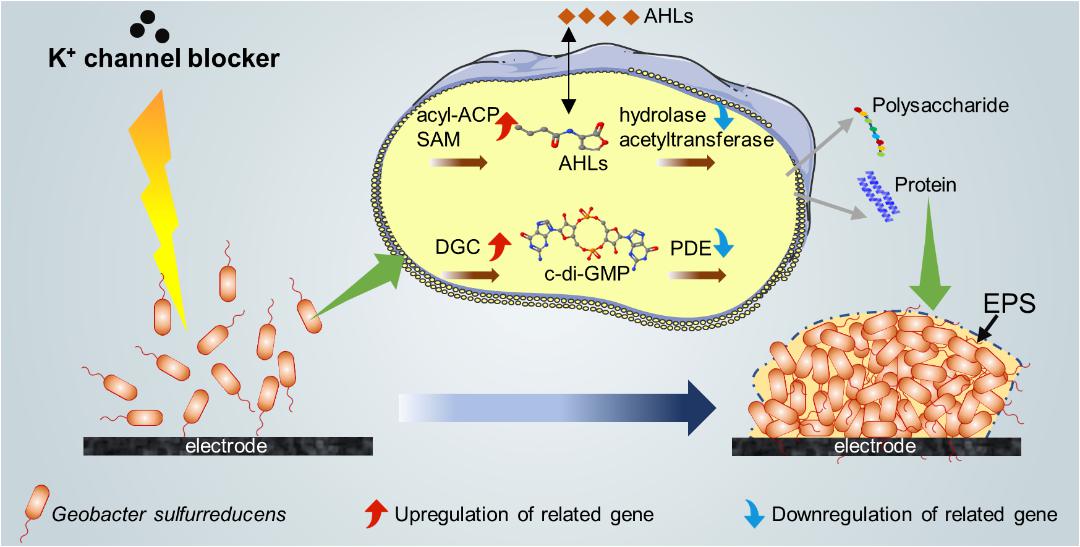 纯菌Geobacter sulfurreducens生物膜形成所涉及的信号通讯过程是复杂多样的,但多种信号通讯方式间相互作用的研究仍处于起步阶段。该研究发现,当生物膜的形成受到电信号通讯阻滞的胁迫时,编码细胞内第二信使c-di-GMP 合成的基因的表达出现上调,同时编码c-di-GMP 降解的基因的表达出现下调,共同促进胞内c-di-GMP 信号分子的积累。与此同时,编码AHLs 合成的相关基因的表达出现上调,编码AHLs 降解的相关基因的表达出现下调,共同促进胞外AHLs 类信号分子的积累。并且,代谢组检测到了C4-HSL的显著性上调(p < 0.001)。胞内c-di-GMP 和胞外AHLs 信号分子均有助于胞外聚合物(EPS)的分泌,最终促进了G. sulfurreducens生物膜的形成。