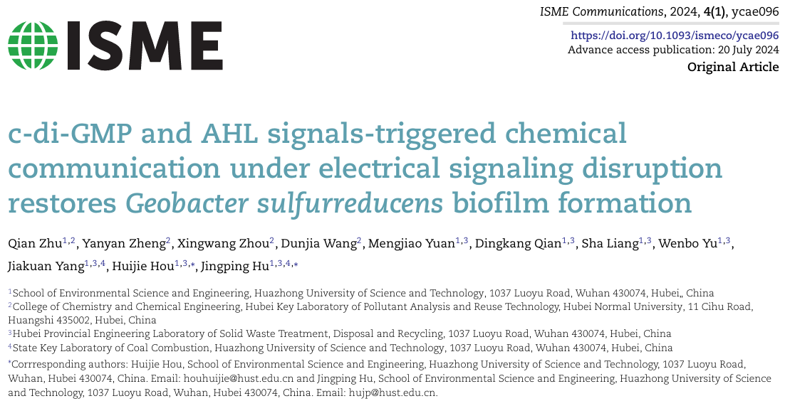 近日,国际知名期刊ISME Communications(《国际微生物生态学通讯》)发表了新葡萄朱倩博士在电活性生物膜领域的最新研究成果。论文题为“c-di-GMP and AHL signals-triggered chemical communication under electrical signaling disruption restores Geobacter sulfurreducens biofilm formation”(电信号通讯阻滞下c-di-GMP 和 AHL信号触发的化学通讯修复Geobacter sulfurreducens生物膜的形成)。朱倩博士为论文第一作者,华中科技大学侯慧杰教授和胡敬平教授为共同通讯作者,华中科技大学、湖北师范大学分别为论文第一、第二通讯单位。ISME Communications是Nature旗下期刊,由国际微生物生态学会主办,是生态学和微生物学研究领域的顶级期刊,最新影响因子为5.1。