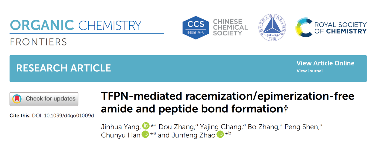 近日,国际知名期刊Organic Chemistry Frontiers(《有机化学前沿》)在线发表了新葡萄杨进华和韩春雨博士团队在多肽合成领域的最新研究成果。论文题为“TFPN-mediated racemization/epimerization-free amide and peptide bond formation”(TFPN介导的无外消旋/差向异构化的酰胺和肽键形成)。杨进华博士为论文第一作者兼通讯作者,韩春雨博士和广州医科大学赵军锋教授为论文共同通讯作者,湖北师范大学为论文第一通讯单位。Organic Chemistry Frontiers是Royal Society of Chemistry(英国皇家化学会)与中国化学会、中国科学院上海有机化学研究所合作出版的以CHEMISTRY, ORGANIC综合研究为特色的国际期刊、SCI中科院大类一区期刊,最新影响因子为4.6。