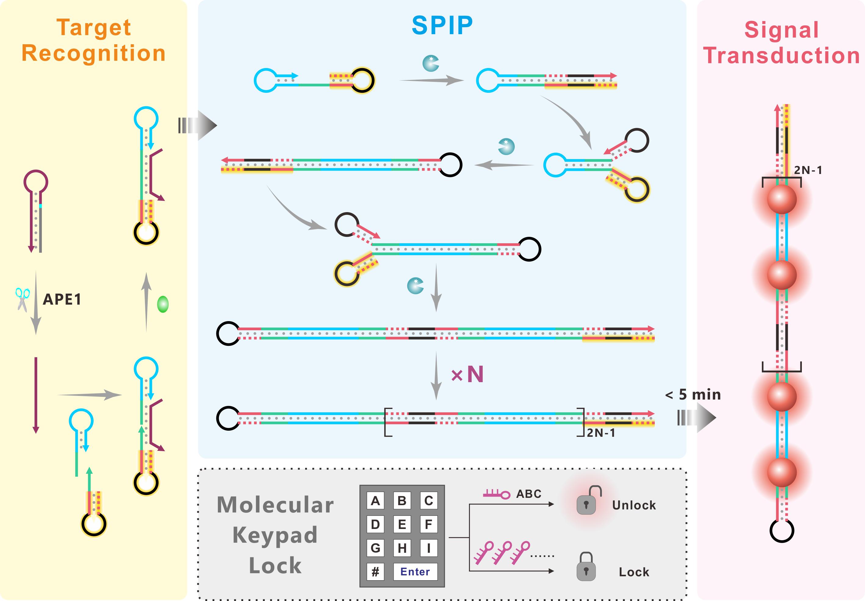 目前,新型分子诊断技术的发展主要依赖于运用易于设计的分子扩增和易于使用的信号转导策略实现生物标志物的准确和灵敏检测。在该项工作中,研究团队成功设计并验证了一种自引等温聚合(SPIP)介导DNA模板纳米铜原位生成的纳米信号放大策略。并将该自包含、免标记信号放大策略成功用于癌症标志物脱嘌呤嘧啶核酸内切酶(APE1)的一管法、高灵敏传感。实验证实,该传感方法能够准确区分正常人体细胞和癌细胞内的APE1含量差异,具有较高的临床诊断应用价值。此外,基于APE1传感原理,该团队还建立了一种级联AND逻辑门和分子键盘解锁模型,进一步展示了传感方法的拓展性和实用性。