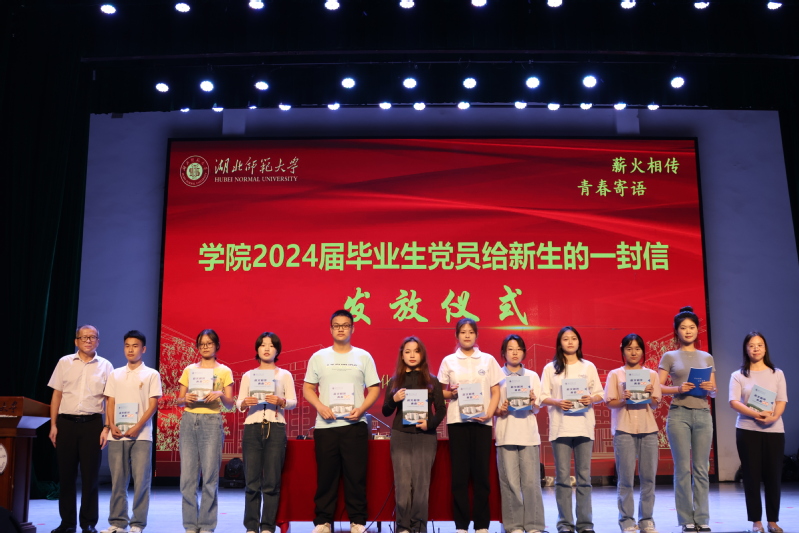 当日,在湖师大礼堂,学院党委书记罗鸿飞、党委副书记吴天真为各班代表发放书信汇编,学生党员在台下为其他学生发放。罗鸿飞在发放仪式上发表了简短的讲话,他表示,开展毕业生党员给新生写一封信的活动是学院党建工作的一个创新,是发挥党员模范带头作用、开展“传帮带”的一个重要途径。本书完整收录了今年毕业的43名本科生和研究生党员的感言、体会与心得,是他们对自己大学生活、研究生生活的回望总结,没有华丽的辞藻、说教式话语,有的只是学长学姐们真挚的情感和用朴实的语言书写的真实事情或生活学习片段。希望全体新生能从其中激发信仰、获得启发、汲取力量,早日明确自己的大学努力方向,努力成长为更好的自己!