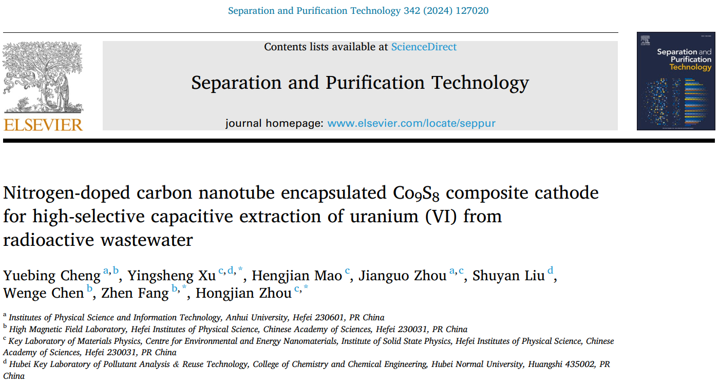 从核废水中选择性电吸附U(VI)对消除有害放射性辐射与资源回收具有重要意义。基于纳米限域效应,开发了一种氮掺杂碳纳米管封装的Co9S8复合材料(CS-NCNT),实现了高效选择性U(VI)电吸附。该工作以“Nitrogen-doped carbon nanotube encapsulated Co9S8 composite cathode for high-selective capacitive extraction of uranium (VI) from radioactive wastewater”为题发表在Separation and Purification Technology(《分离纯化技术》)。新葡萄8883官网AMG徐应生博士、中国科学院强磁场科学中心房震研究员、固体物理研究所周宏建研究员为共同通讯作者,湖北师范大学为通讯单位之一。Separation and Purification Technology是Elsevier(爱思唯尔)出版社旗下工程技术领域期刊、SCI中科院大类一区期刊,最新影响因子为8.1。