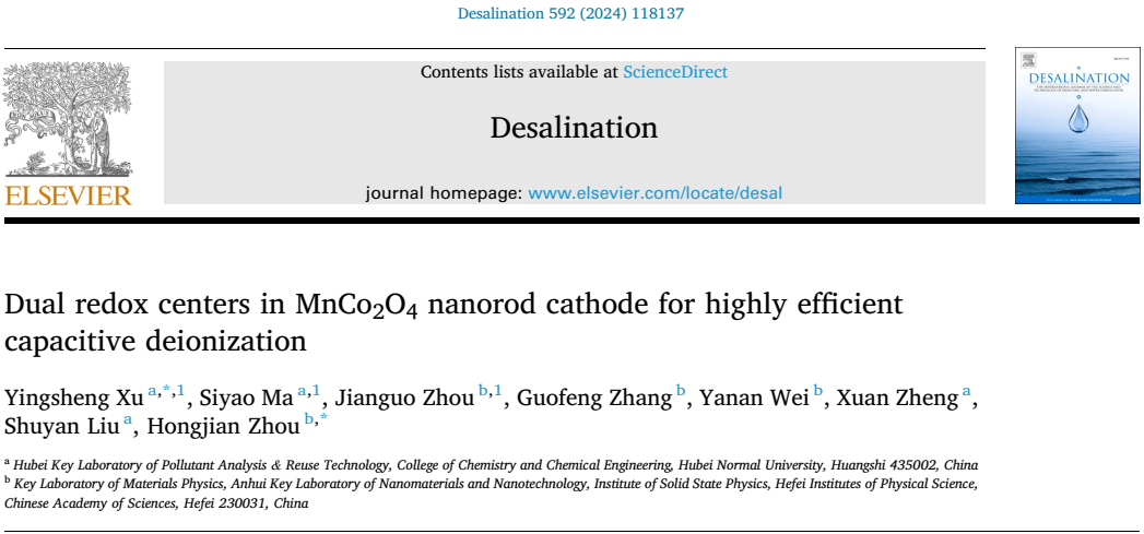其中,基于法拉第转换机制与双氧化还原中心结合策略,发展了一种MnCo2O4纳米棒阴极材料。该工作以“Dual redox centers in MnCo2O4 nanorod cathode for highly efficient capacitive deionization”(基于MnCo2O4纳米棒阴极双重氧化还原中心的高效电容脱盐)为题,发表于Desalination(《脱盐》)。徐应生博士为论文第一作者和通讯作者,中科院合肥研究院周宏建研究员为论文共同通讯作者,实验与数据处理部分由课题组2021级本科生马斯窅(论文共同第一作者)独立完成,湖北师范大学为论文第一单位,该工作获得湖北省第十七届大学生化学(化工)学术创新成果报告会二等奖。Desalination系Elsevier(爱思唯尔)出版社旗下工程技术领域期刊、SCI中科院大类一区期刊,最新影响因子为8.3。