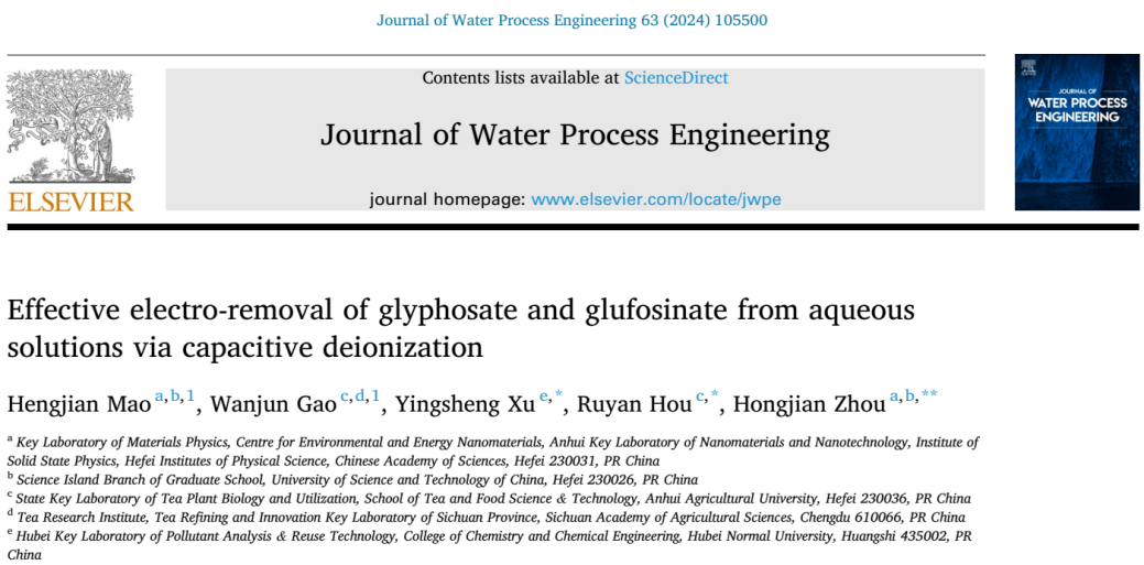草铵膦(Gly)和草甘膦(Glu)都是常用的除草剂,其对环境和人类健康的影响引发担忧。通过原位电氧化与电容吸附的有效结合,碳基CDI技术实现了对水体中除草剂的分解和去除。该工作以“Effective electro-removal of glyphosate and glufosinate from aqueous solutions via capacitive deionization”为题发表在Journal of Water Process Engineering(《水处理工程杂志》)。新葡萄8883官网AMG徐应生博士、安徽农业大学侯如燕教授、中科院合肥研究院周宏建研究员为论文共同通讯作者,湖北师范大学为通讯单位之一。Journal of Water Process Engineering是Elsevier(爱思唯尔)出版社旗下工程技术领域期刊、SCI中科院大类二区期刊,最新影响因子为6.3。