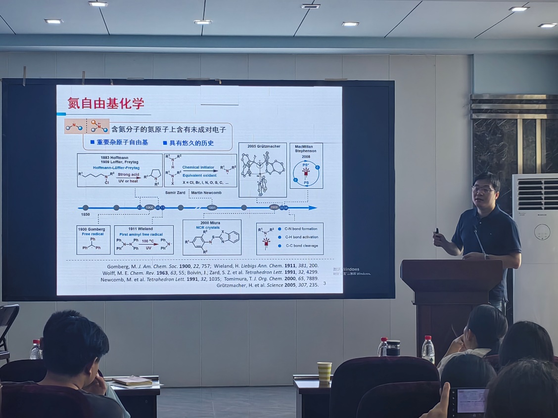 陈加荣教授以“可见光驱动的氮自由基合成化学”为题,首先概述了氮自由基化学的当前发展状况及其面临的挑战,随后详细介绍了其团队在光驱动氮自由基化学领域的突破性工作。报告内容主要包含:1)氮自由基介导的碳-碳偶联反应;2)氮自由基介导的不对称碳-碳偶联反应;3)氮自由基介导的不对称碳-氧偶联反应;4)氮自由基介导的可控自由基羰基化反应等。