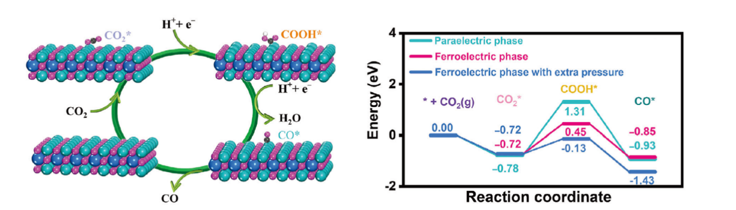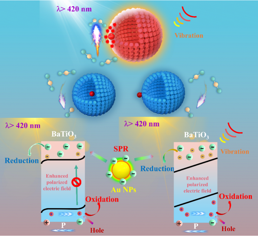 蛋黄-蛋壳纳米结构被广泛应用在生物和能源领域,然而结构本身的性能与稳定性冲突的问题仍然有待解决。研究团采用以钛酸钡为基底,金纳米粒子为活性中心组成的壳中核纳米结构催化剂(Au@BT)。并通过极化调节材料的内建电场以及界面电子相互作用,可以实现可见光和机械能协同催化CO2转化还原。研究表明,Au@BT壳中核材料在无牺牲剂的情况下表现出出色的压电光催化CO生成速率31.29 μmol g-1 h-1。实验和理论结果表明,独特的功能结构设计和增强的极化电场表现出优异的机械力敏感响应和超高的结构稳定性,从而提供丰富的等离子体诱导的界面电荷转移途径,加速光生电子从金纳米粒子向钛酸钡的转移。 更为重要的是,铁电极化电场的增强不仅是促进载流子迁移的强大驱动力,而且降低了CO2还原反应中关键中间体COOH*形成的能垒。密度泛函理论(DFT)计算结果表明,在CO2转化还原过程中,铁电相的BT比顺电相的BT具有更低的能垒。特别是,当对铁电相BT施加模拟压力时,能垒急剧降低(0.59 eV),这表明超声振动诱导的压电极化可以有效地激活关键中间体,促进CO2轻松还原为CO。这一观察结果也与CO2温度程序脱附(CO2-TPD)实验相一致,进一步表明由极化诱导电场的建立和增强,促进了CO2的还原。此外,Au NPs和BT之间的界面相互作用在BT的导带边缘附近创造了更多的可用态,可能增强了光生电子的产生。上述理论结果共同强调了增强的诱导极化电场和紧密的界面接触在高效吸附和激活CO2中的重要性,最终导致催化性能的显著提升。该研究为开发用于绿色能源转化的高性能、多响应催化剂开辟了优化结构设计和极化电场调控的潜力和深层次认识。
