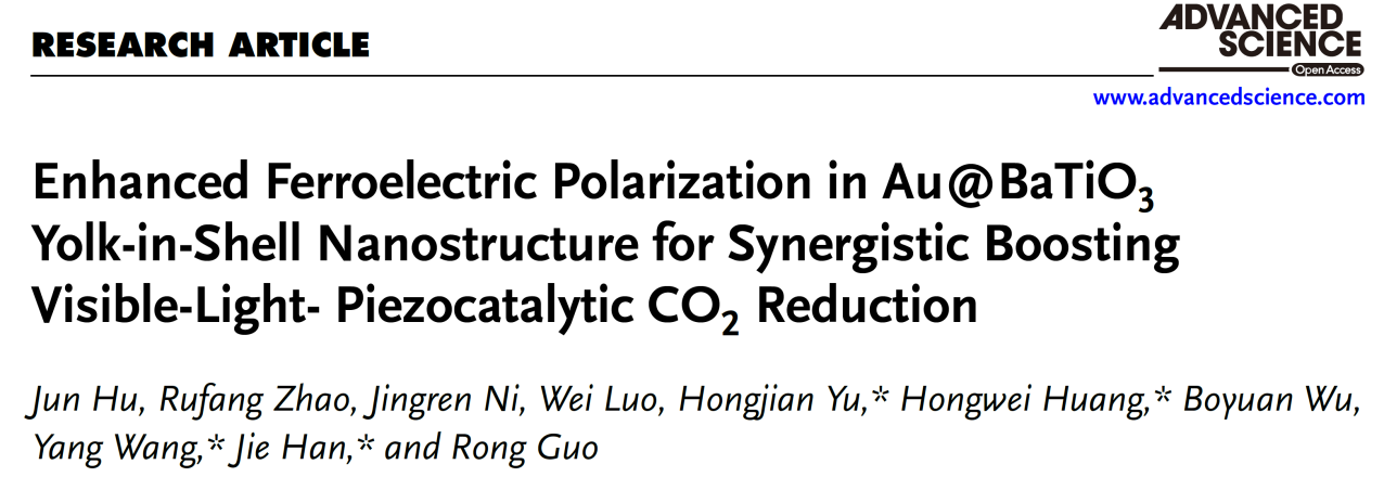 近日,新葡萄赵茹芳博士与扬州大学胡俊博士合作,在国际知名期刊Advanced Science(《前沿科学》)上发表新型壳中核纳米催化剂Au@BaTiO3在压电光催化CO2转化还原中的最新研究成果。论文题为“Enhanced Ferroelectric Polarization in Au@BaTiO3 Yolk-in-Shell Nanostructure for Synergistic Boosting Visible-Light-Piezocatalytic CO2 Reduction”(新型Au@BaTiO3壳中核纳米结构中增强的铁电极化用于协同增强可见光-压电光催化CO2还原)。扬州大学胡俊博士为论文第一作者,新葡萄赵茹芳博士为共同第一作者,扬州大学于洪鉴博士、汪洋教授、韩杰教授以及中国地质大学(北京)黄洪伟教授为共同通讯作者,湖北师范大学为论文第二通讯单位。赵茹芳博士负责机理解释和理论计算部分。Advanced Science是Wiley出版社旗下综合性期刊、SCI中科院大类一区期刊,最新影响因子为14.4。