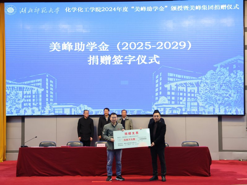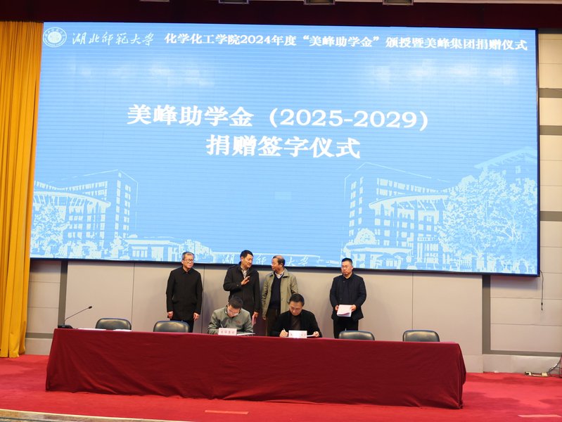 余涛与曾铁鸣共同为2023年获资助的在校9名同学颁授证书、为2024年获资助的10名同学颁发助学金及证书。根据2020年设立“美峰助学金”协议,第一期“美峰助学金”已满五年,学院共50人次在校期间获得资助,其中已有26名受助学生顺利完成学业,9名毕业生顺利考上硕士研究生继续深造。为了庚续回馈母校、捐资助困的企业社会责任,曾铁鸣董事长及美峰集团经研究,决定继续设立“美峰助学金”并扩大资助额度和范围,在未来五年面向新葡萄8883官网AMG贫困学子,捐赠50万元用于资助100名品学兼优的贫困学子。会上,美峰集团代表、湖北美峰化学有限公司总经理柯生辉、湖北师范大学教育发展基金会秘书长、校友工作处处长刘洋,分别代表美峰集团及湖北师范大学教育发展基金会签订捐赠协议。