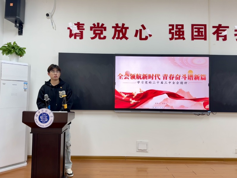 陈溪宁以“全会引领现时代,青春奋斗谱新篇”为主题,分别从二十届三中全会的核心与精神、重大意义、新时代大学生的使命与担当三个方面展开。首先,陈溪宁简要概述全会的基本情况,解读了全面深化改革与进一步深化改革的联系与区别,并介绍了中国式现代化的中国特色与奋斗目标。随后,陈溪宁讲解了三中全会的重大意义。并选取“劳动性所得”“新就业形态”“增新制度”“生育友好型”四个与大学生个人发展密切相关的名词,让三中全会与听众的生活结合了起来。