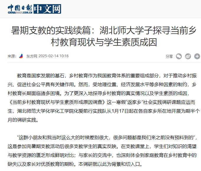 《暑期支教的实践续篇:湖北师大学子探寻当前乡村教育现状与学生素质成因》由中国日报网于2月14日发布。此次实践活动中,学院“化爱前行实践队”于1月17日起,在各自家乡所在地开展了为期半个月的调研。队员们以乡镇及以下级别的小学、初中为研究对象,通过查阅政策文件、学术论文等资料,精心设计问卷,面向学生监护人、教师等多群体,采用线上线下结合的方式进行问卷调查和访谈,最终收集到5184份有效问卷和163份访谈记录。调研结果显示,乡村学校学生素质整体良好,但综合素质存在分化差距。学业成绩分化,英语学科薄弱;品德表现良好但有提升空间;实践能力有待增强;心理健康问题需关注;身体素质参差不齐;校园关系总体和谐但存在问题。影响学生素质的因素包括家庭、学校、社会三个方面。对此,受访者和实践队成员提出优化课程设置、提升教师素养、加强家校协同、丰富学生活动、合理引导新媒体使用等建议。