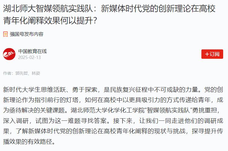 《湖北师大智媒领航实践队:新媒体时代党的创新理论在高校青年化阐释效果何以提升?》发布于“学习强国”学习平台,发布时间为2月13日。学院“智媒领航实践队”从1月20日起,利用“朋友圈”开展为期半个月的调研。实践队由学生党员和院团委宣传部学生干部组成,他们查阅大量资料后设计问卷,面向大学生群体线上线下发放回收,还对大学生、高校教师和新媒体运营人员进行访谈。调研发现,调研发现,学生对党的创新理论认知差异大,主动关注和深入了解程度不足;新媒体平台在传播中利弊共存;近七成学生认为“青年化阐释”很重要,但存在传播形式单一等影响因素。基于调研结果,学生期望结合热点阐释、邀请青年榜样参与、优化推送机制、加强平台协同。也对学校宣传队伍提出开发优质资源、举办多样活动等建议。此次调研呈现了现状、问题和学生期望,为提升党的创新理论在高校青年化阐释的传播效果提供了数据支持和方向指引。