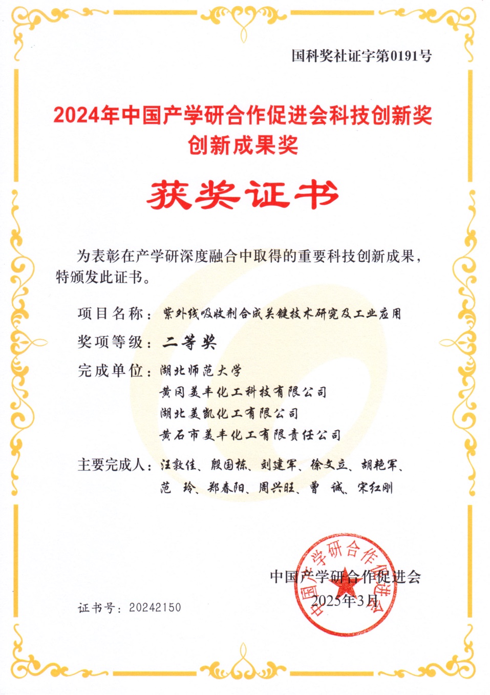 该研究团队经过十几年持续与美峰集团的深度合作,专注于紫外线吸收剂合成关键技术、新产品研发以及绿色化工艺改造等关键技术难题,提升了紫外线吸收剂关键技术自主创新能力,推动了行业技术进步和发展。近年来,团队成员申请国家发明专利30余件,获得授权专利26件;获得中国发明协会发明创业奖成果奖二等奖1项、中国产学研合作创新奖1项、湖北省技术发明奖二等奖2项、湖北省科技进步奖三等奖6项,并发表SCI收录论文100余篇。