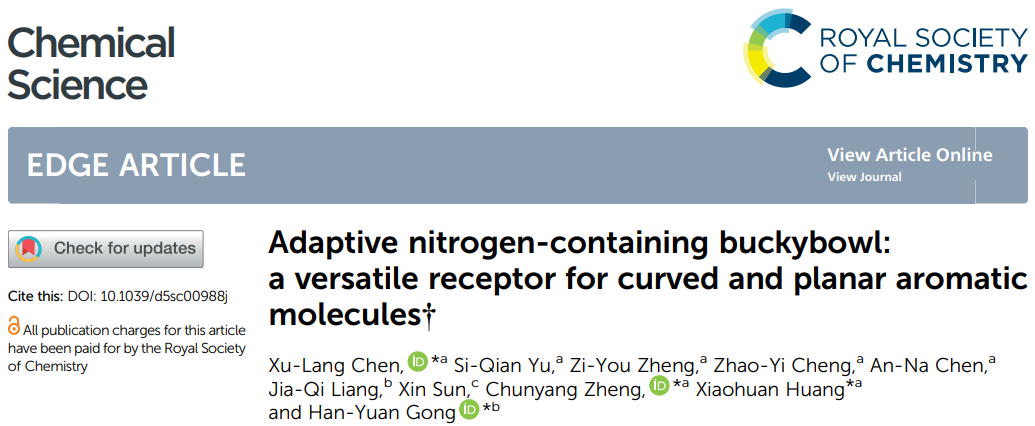 第一篇论文题为“Adaptive Nitrogen-Containing Buckybowl: A Versatile Receptor for Curved and Planar Aromatic Molecules”(适应性含氮巴基碗:一种可作用于弯曲及平面芳香分子的多功能受体)。陈绪朗博士为论文第一作者兼通讯作者,郑春阳副教授、黄小欢教授和北京师范大学龚汉元教授为论文共同通讯作者,湖北师范大学为论文第一通讯单位。