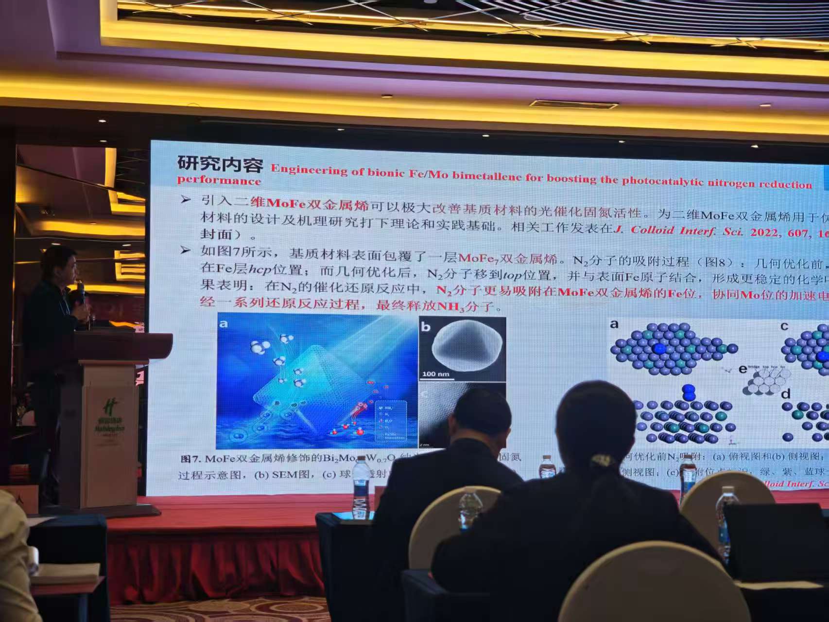 李宏达副研究员作了题为《多级构筑GdC3N4/Mo15S19复合材料促使N2活化和多电子转移以增强光催化固氮性能》的报告。相关研究工作以掺杂Gd协同负载Mo15S19的新型g-C3N4纳米棒为研究对象,提出Gd和Mo15S19协同作用能有效降低中间体的吉布斯自由能,同时,Mo15S19有助于激活N≡N键,从而提高了整体光催化效率。该团队为构建包含多重电子转移和N2活化效应的光催化NRR多级结构提供了一种可行的方案。