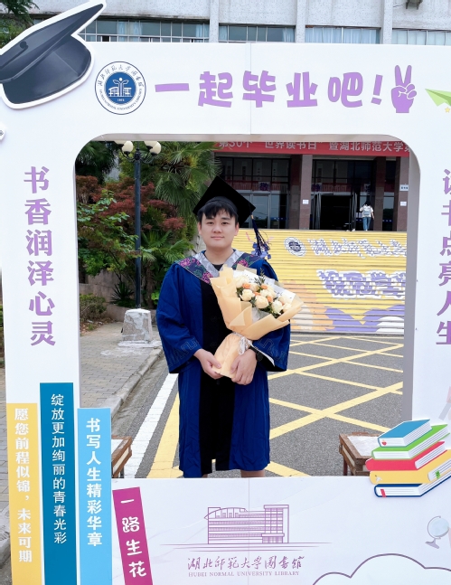 七年的湖师岁月倏忽而过,心中满载着恩情与成长的印记。难忘恩师谆谆教导,如春风化雨,润泽我心;感激父母无言付出,是远行路上最坚实的依靠;感谢同窗并肩同行,让这段求学旅程充满温暖与力量。临别依依,惟愿所有师友、亲人一生平安喜乐。愿未来的我发扬湖师校训,做到诚毅勤敏。更衷心祈愿母校湖北师范大学——薪火永续,桃李天下,辉耀百年,芳华永驻!