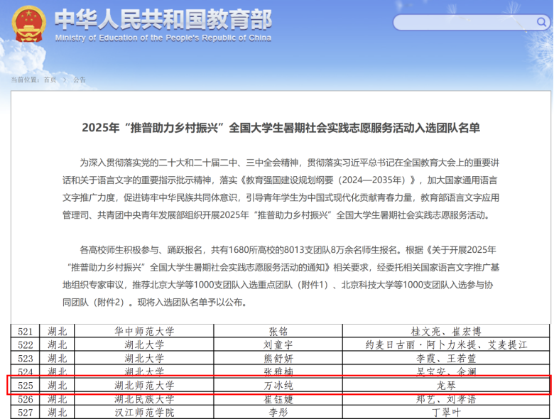 青苗语润实践队入选2025年“推普助力乡村振兴”全国大学生暑期社会实践志愿服务重点团队,全国共1000支团队入选重点团队。该活动由教育部语言文字应用管理司、共青团中央青年发展部共同组织开展,旨在加大国家通用语言文字推广力度,促进铸牢中华民族共同体意识,引导青年学生为中国式现代化贡献青春力量。新葡萄以《少数民族聚居区国家通用语言认同与使用现状调研》为题进行申报,将开展“推普+语言调查”实地调研。指导老师为辅导员龙琴,化学(优师)2207班万冰纯同学为队长。