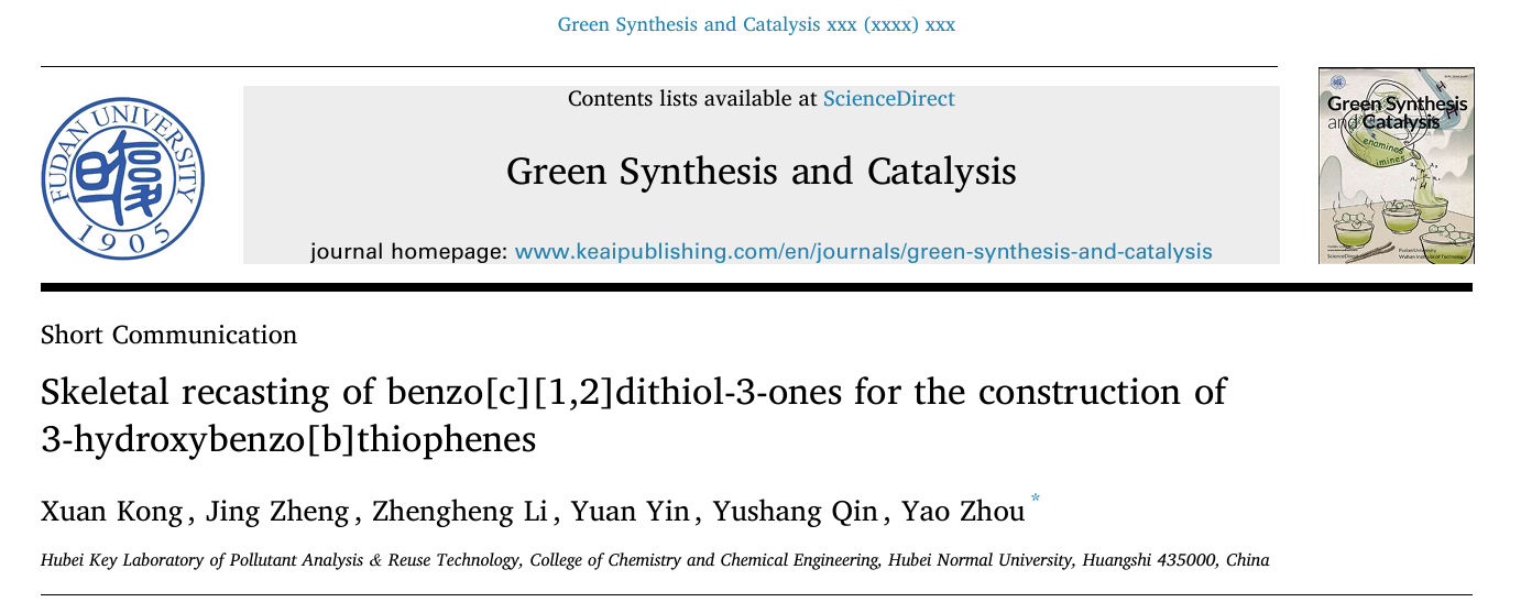 近日,国际知名期刊Green Synthesis and Catalysis(《绿色合成与催化》)在线发表了化工工艺教研室周耀副教授在分子骨架编辑领域的最新研究成果。论文题为“Skeletal recasting of benzo[c][1,2]dithiol-3-ones for the construction of 3-hydroxybenzo[b]thiophenes”(苯并二磺酚酮的骨架重组构建3-羟基苯并噻吩)。新葡萄2023级硕士研究生孔暄为论文第一作者,周耀博士为论文通讯作者,湖北师范大学为论文唯一通讯单位。Green Synthesis and Catalysis是ELSEVIER(爱思唯尔)出版社旗下绿色合成与催化领域期刊、中科院大类一区期刊,最新影响因子为6.3。