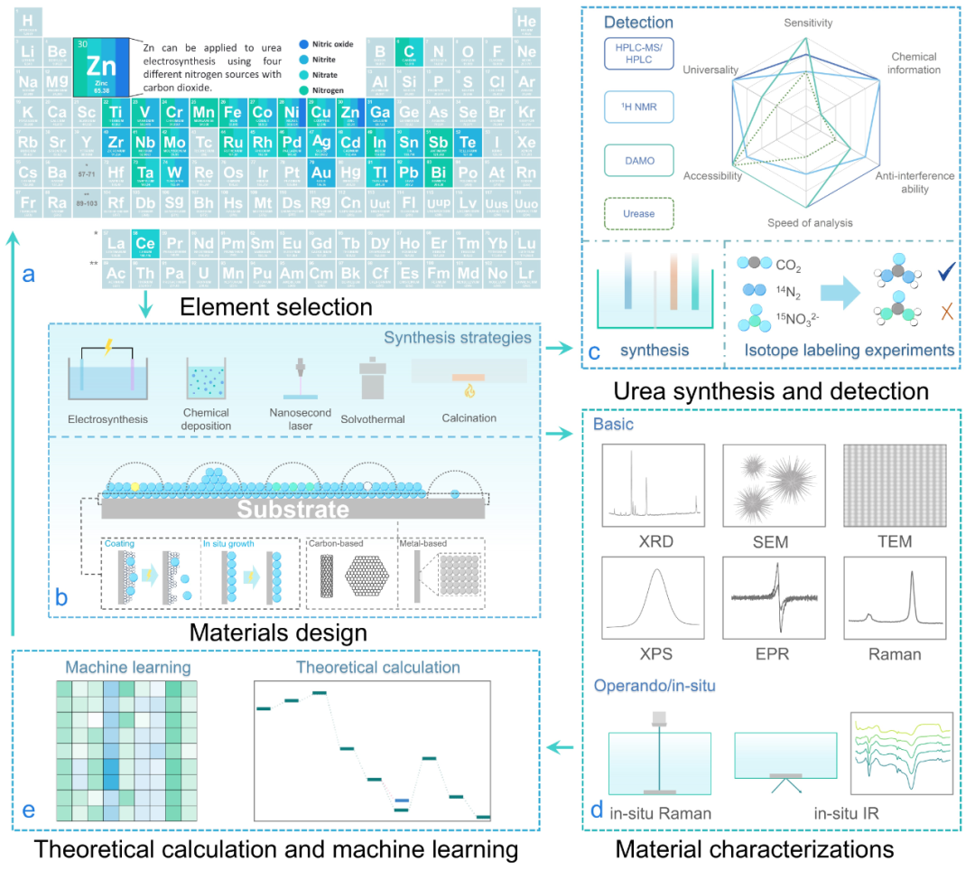 尿素作为重要的氮肥与基础化工原料,在农业和工业中均占据关键地位。然而,传统 Bosch–Meiser 工艺依赖化石燃料并在高温高压下运行,能耗高且排放严重。相比之下,尿素电合成通过电催化 C-N 偶联在常温常压下以 CO2 与含氮物质为原料生产,兼具环境友好与过程可控优势,并有助于实现碳中和。尤其是 NO3-/NO2- 因易还原和低毒性而成为理想氮源,其与水体硝酸盐污染治理的结合进一步凸显环境协同效益。然而,该过程仍面临选择性不足与尿素产率有限的挑战,亟需新型高效电催化剂的开发。该研究系统梳理了尿素电合成催化剂的发展脉络,深入探讨催化剂的构效关系与设计策略,全面总结电解槽结构、反应环境、产物检测及机理解析的最新进展,并简要概述密度泛函理论(DFT)与机器学习(ML)在催化剂筛选中的应用。最后,对未来理论预测与电催化剂设计的关键挑战与发展机遇进行展望,以期为该领域的研究者提供从电催化剂设计视角出发的系统参考。