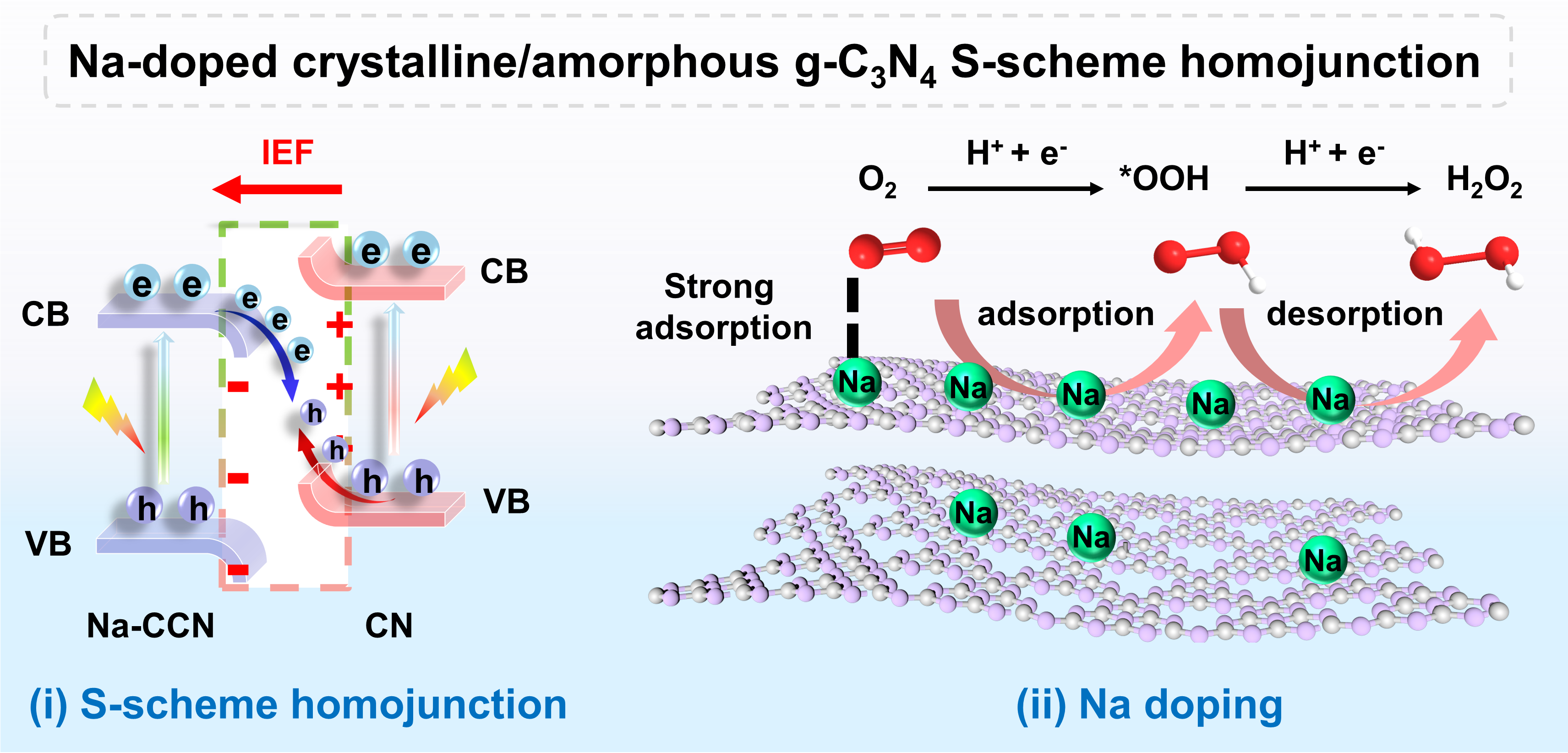 该研究基于一种创新的Na2CO3诱导结晶调控策略,成功实现钠掺杂结晶/非晶g-C3N4 S型同质结光催化剂的一步制备。采用该方法所合成的光催化剂在过氧化氢合成中表现出优异的催化性能,最优生成速率达444.6 μmol·L-1·h-1,是传统g-C3N4材料的6.1倍。通过多种材料表征手段与理论计算分析表明,S型同质结结构有效促进了光生电荷的空间分离与传输效率;同时,钠离子掺杂优化了O2吸附与*OOH等关键反应中间体的转化路径,显著提升了H2O2的界面生成动力学。二者的协同作用推动了该催化剂性能的显著增强。本研究为开发高性能光催化剂提供了新思路,在太阳能燃料合成及光催化应用领域展现出广阔前景。