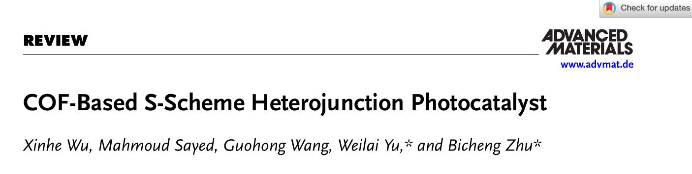 9月,Advanced Materials(《先进材料》)在线发表该团队最新综述成果,论文题为“COF-based S-scheme heterojunction photocatalyst”(《COF基S型异质结光催化剂》)。吴新鹤副教授为论文第一作者,湖北师范大学王国宏教授为论文共同作者,中国地质大学(武汉)朱必成教授和加拿大多伦多大学余维来教授为论文通讯作者,湖北师范大学为论文第一通讯单位。Advanced Materials是Wiely出版社旗下材料科学领域顶尖期刊、中科院SCI材料科学大类一区TOP期刊、自然指数期刊,最新影响因子为26.8。