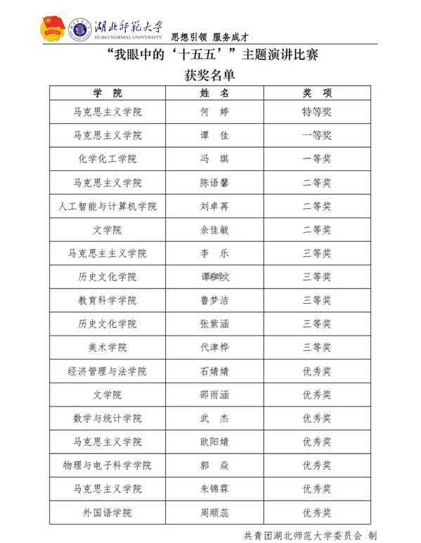 11月27日下午,湖北师范大学“我眼中的‘十五五’”主题演讲比赛决赛在信息大楼报告厅举行。党委统战部常务副部长熊荣伍,教学督导委员会副主任吴瑞霞,纪委、监察专员办公室综合室副主任柯静,学工处副处长熊英,发规处副处长颜永才受邀担任比赛评委。经过前期初赛,本次有18名选手晋级决赛,新葡萄化学(优师)专业2401班冯琪同学凭借稳定发挥获一等奖,位列第3名。