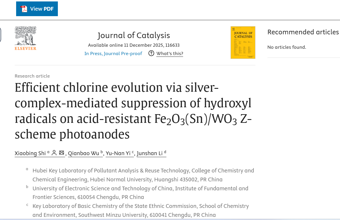 近日,Journal of Catalysis在线发表了新葡萄化工教研室石小兵博士的最新研究成果。论文题目为“Efficient Chlorine Evolution via Silver-Complex-Mediated Suppression of Hydroxyl Radicals on Acid-Resistant Fe2O3(Sn)/WO3 Z-Scheme Photoanodes”(利用银配合物介导抑制羟基自由基在耐酸Fe2O3(Sn)/WO3 Z型光阳极上实现高效析氯)。石小兵博士为论文第一作者兼通讯作者,湖北师范大学为论文唯一通讯单位。Journal of Catalysis是Elsevier出版社1962年起发行的国际期刊,主要报道有催化方面的最新研究进展,是中科院一区top期刊,最新影响因子为6.5。