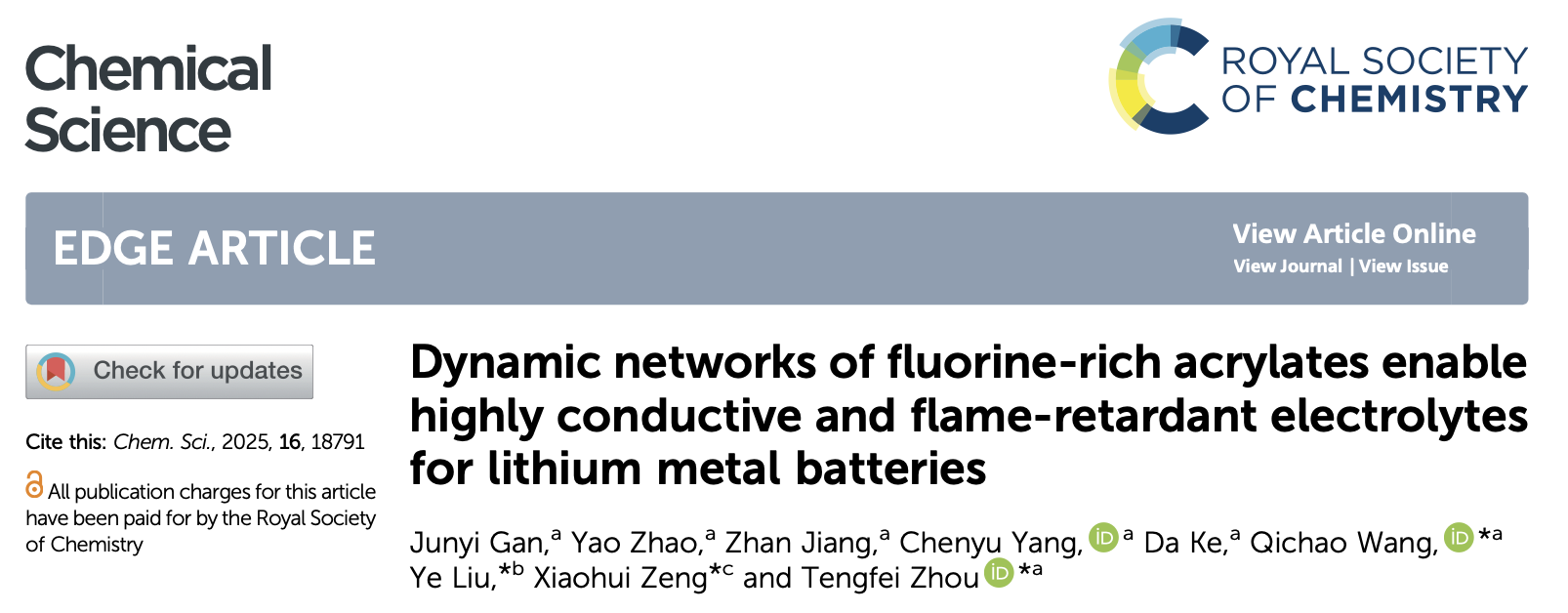 在锂金属电池关键电解质材料方面,研究团队通过原位共聚策略,构建了一种由丙烯酰胺(AM)与富氟丙烯酸酯(HFA)组成的动态凝胶聚合物电解质网络。研究表明,–CF₃ 与C=O官能团之间的协同偶极作用可有效调控锂盐溶剂化结构,促进锂盐解离并构建快速Li⁺ 传输通道,同时通过–NH₂基团对阴离子的锚定显著提高锂离子迁移数。理论计算与多尺度表征结果显示,该动态网络有利于在电极界面形成富含LiF的稳定SEI/CEI层,从而有效抑制锂枝晶生长并提升电池安全性与循环稳定性。电化学测试表明,该凝胶聚合物电解质在室温下实现了1.21 × 10⁻³ S·cm⁻¹的离子电导率和0.68的锂离子迁移数,Li‖Li对称电池可稳定循环超过1000 h,LFP‖Li全电池在200次循环后仍保持约87%的容量保持率。该成果于9月发表于中科院SCI大类一区、自然指数期刊Chem. Sci.(IF:7.9),刘野博士、德国亥姆霍兹研究所曾小慧研究员、安徽大学王启超博士和周腾飞教授为论文共同通讯作者,湖北师范大学为论文第二通讯单位。