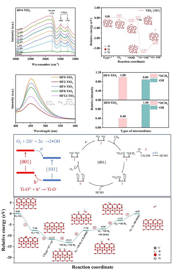 在光催化甲烷转化领域,如何在温和条件下实现甲烷向高附加值化学品(如甲醛)的高效、高选择性转化一直是国际研究前沿与难点。传统热催化路线通常依赖贵金属助催化剂,能耗高、成本大,且易发生烧结和积碳失活;而纯半导体光催化体系则普遍面临光生载流子复合快、反应路径难以调控、产物选择性低等问题。针对上述挑战,研究团队提出并实施了晶面工程策略,在单一锐钛矿TiO2晶粒内精准构筑具有明确界面的 {001}/{101} 晶面结,实现了光生电荷空间分离与反应路径的定向调控。