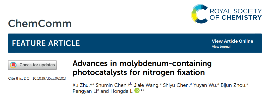2025年12月,Chemical Communications(《化学通讯》)在线发表了该团队在光催化固氮领域的研究综述,论文题为“Advances in Molybdenum-Containing Photocatalysts for Nitrogen Fixation”(含Mo光催化固氮催化材料的研究进展)。李宏达博士为论文唯一通讯作者,湖北师范大学为论文第一通讯单位,应用化学专业2305班本科生朱旭与荆楚理工学院陈淑敏教授为论文共同第一作者。Chemical Communications是自然指数期刊、中科院二区TOP期刊,最新影响因子为4.2。